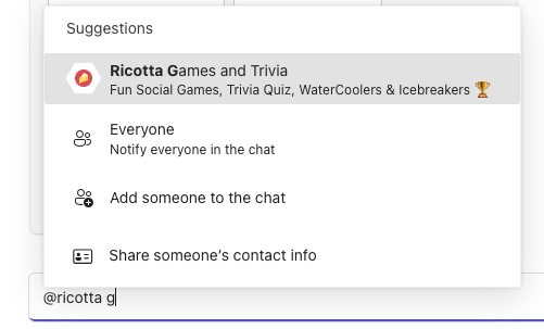 #### 3. Next, type @Ricotta Games & Trivia hello